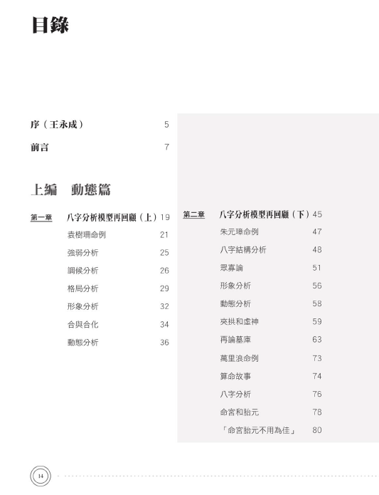 本书分为上下两篇。上编「动态篇」将多视角分析从八字原局本身,延伸到大运和流年的动态分析上,提供了具有时序性重点的分析模型。更揭示了在强弱、格局等方面,随大运和流年做出动态调整的可变性规律。