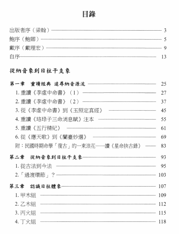 本书分两个部分。第一部分是从纳音象到日柱干支象共四章。通过回頋早期命理经典,作者梳理了干支纳音象的演进歴程。在探讨古法向今法转移的过程中,作者发现了一个从纳音象到日柱干支象的「过渡」阶段。这是一个被遗忘的歴史角落,可以追溯到明代中叶的《格物至言》。